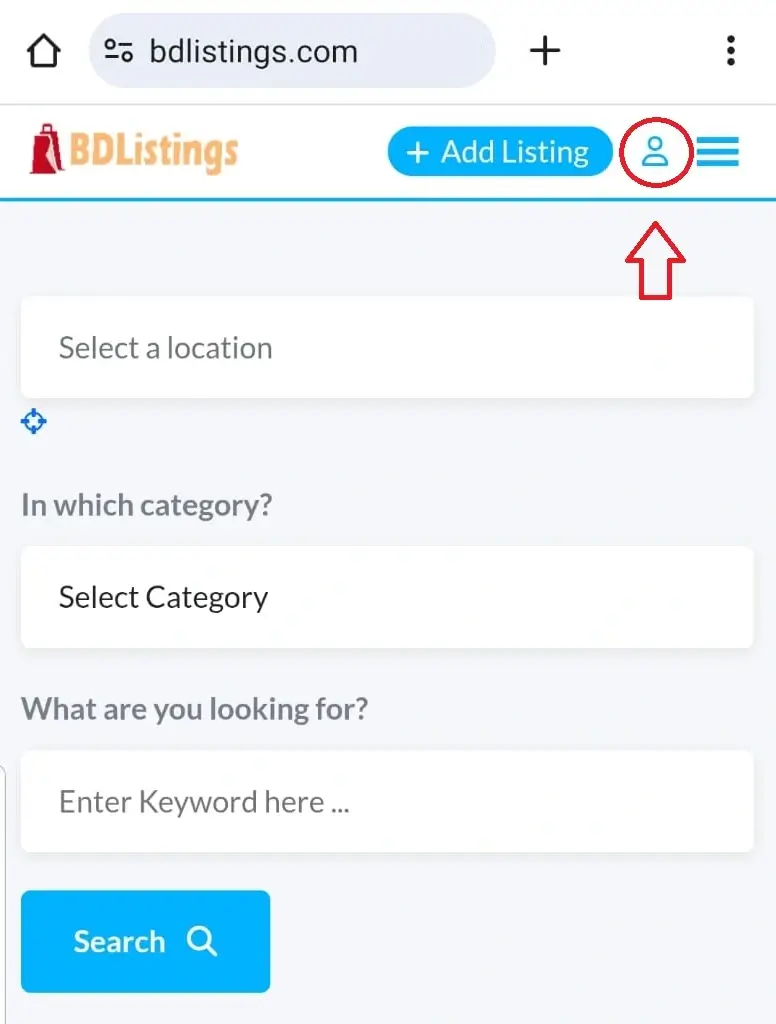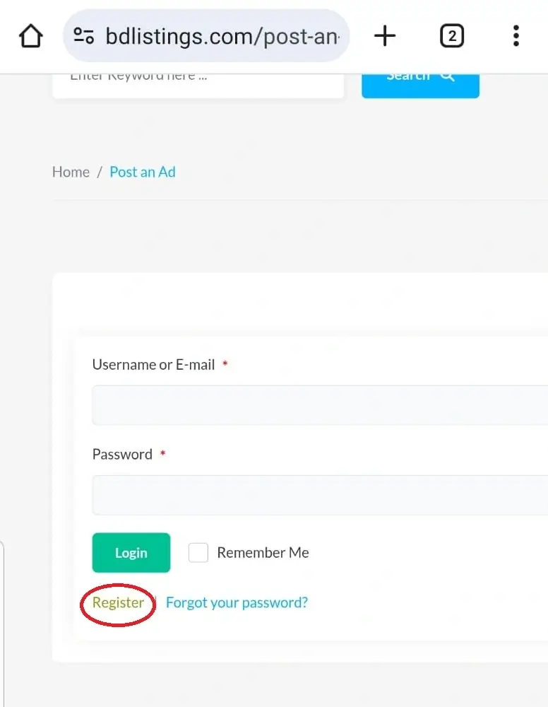 ধাপ-১ঃ প্রথম ছবিতে গোল মার্ক দেয়া আইকন অথবা Add Listing- এ ক্লিক করুন তাহলে লগইন ফরম সামনে আসবে (দ্বিতীয় ছবির মতো), নিচে লাল চিহ্নিত লেখা Register স্থানে ক্লিক করুন।